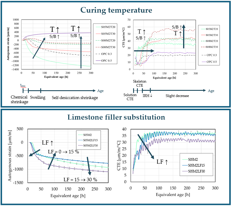 In this PhD thesis, the objective is to study the impact of various factors on the volume changes of alkali- activated materials, with a focus on their autogenous and thermal strain. Factors such as the amount of solution, activator type, concentration, and temperature conditions as well as internal relative humidity have an important influence on how the early-age volume develops. The mitigation effect of limestone filler, metakaolin, and curing temperature will be investigated as well. To address the issue of cracking, the cracking behaviour of these materials will be studied with acoustic emission.