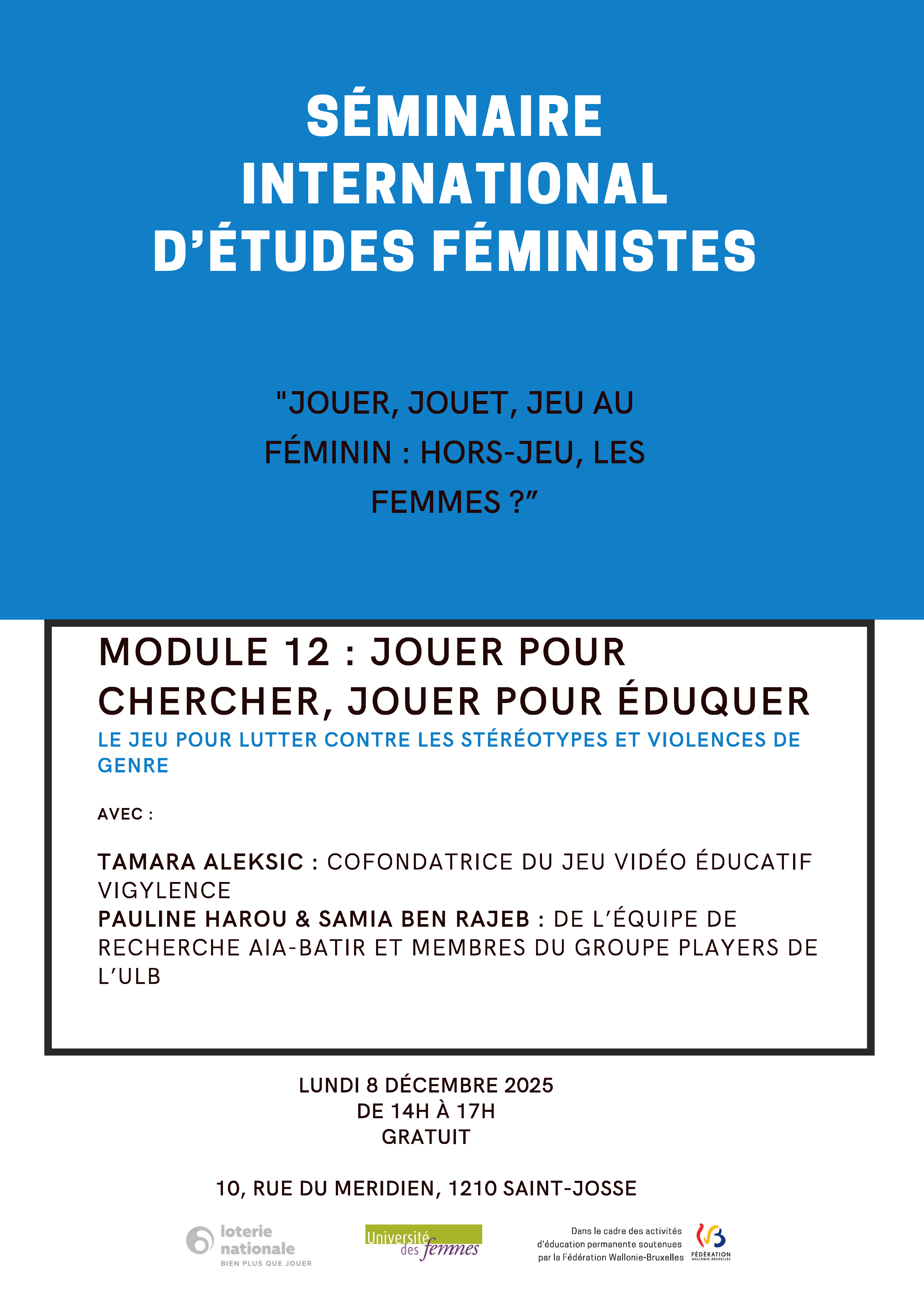 L'Université des Femmes a pour mission de développer et diffuser des savoirs scientifiques féministes. Dans ce but, nous organisons chaque année depuis plus d'une décennie un cycle annuel de formation ouvert à tous et toutes. Cette année, 13 modules constituent le SIEF, qui a pour thème « Jouer, jouet, jeu au féminin : hors-jeu, les femmes ? » et qui s’intéresse aux discriminations sexistes qui existent au sein de l'univers des "jeux", au sens large.